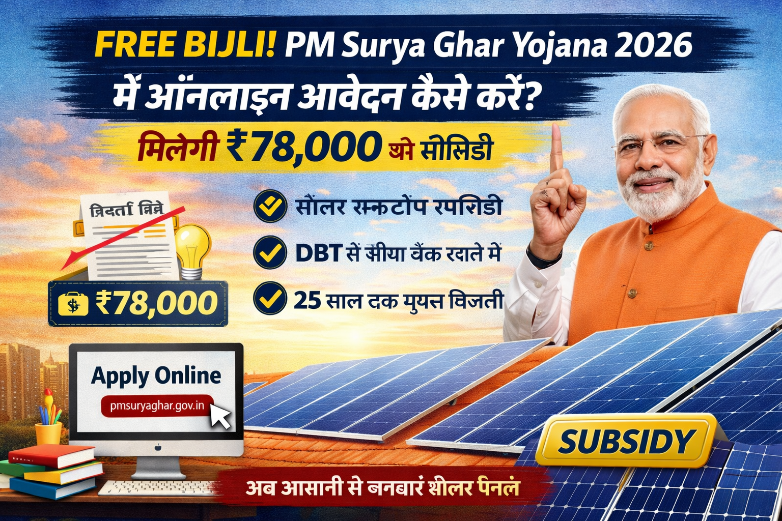 FREE BIJLI! PM Surya Ghar Yojana 2026 में Online आवेदन कैसे करें? मिलेगी ₹78,000 तक की सब्सिडी | पूरी जानकारी